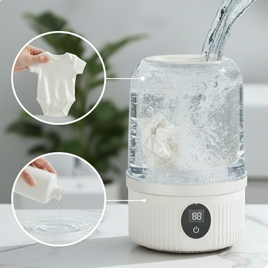 1. Prep & Load : Quickly unfold the unit. Simply add water, a splash of detergent, and your small load (intimates, baby clothes, etc.). It's designed for separate, hygienic cleaning.